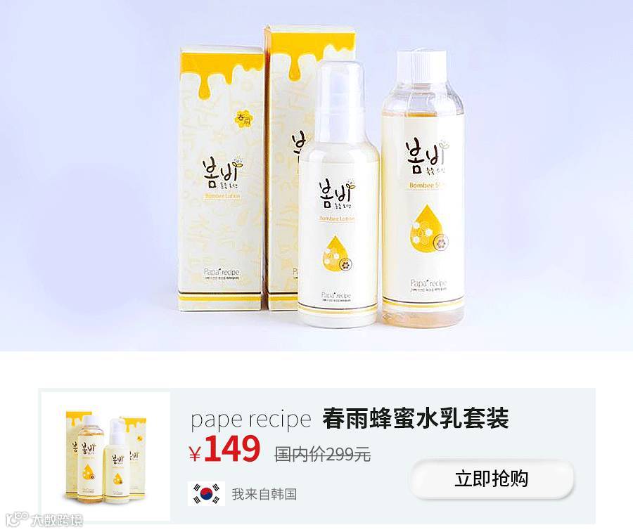 Papa recipe 春雨公司全新力作,春雨水乳套装。6种无添加,萃取蜂胶蜂蜜芦荟营养精华,为肌肤带来春雨般滋润呵护,让你的肌肤光泽细腻,水水嫩嫩。