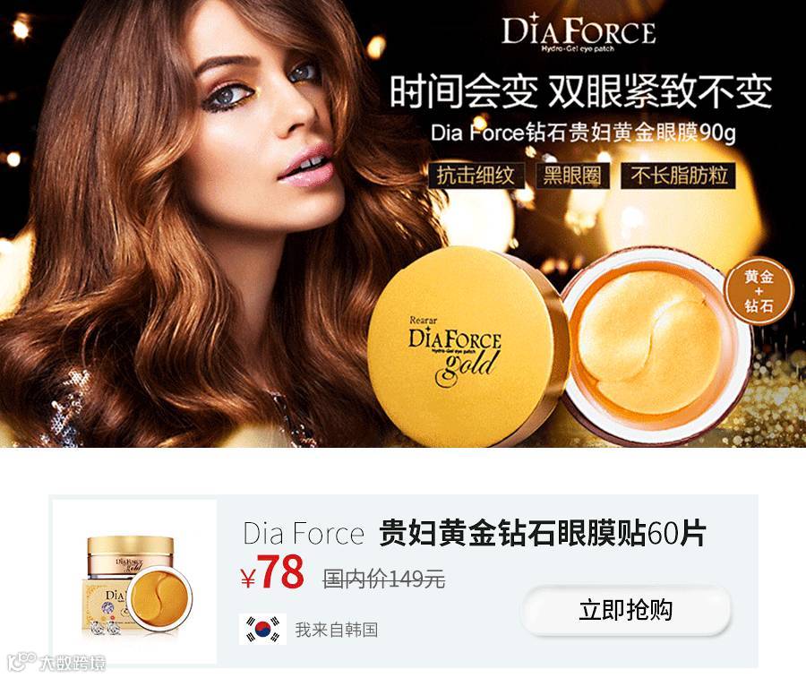 时间会变,双眼紧致不变—Dia Force钻石贵妇黄金眼膜。抗击细纹黑眼圈,拒绝脂肪粒。盈润肌密,跟岁月说慢走。