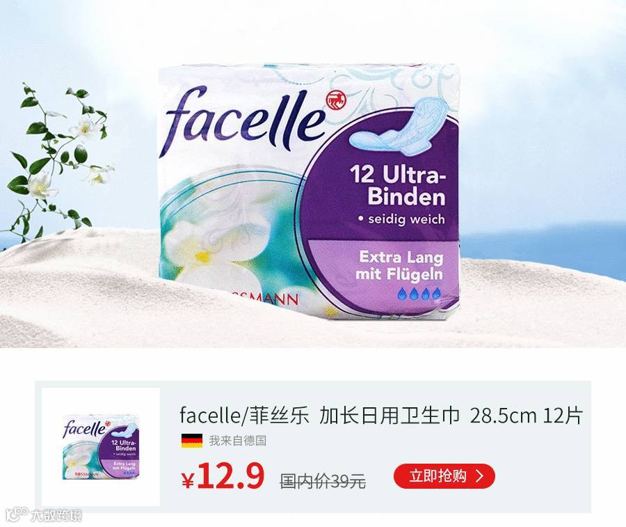 来自德国的贴心呵护。搞定姨妈2大优势:0荧光,告别生理期刺激敏感;轻盈瞬吸干爽,安全舒适。