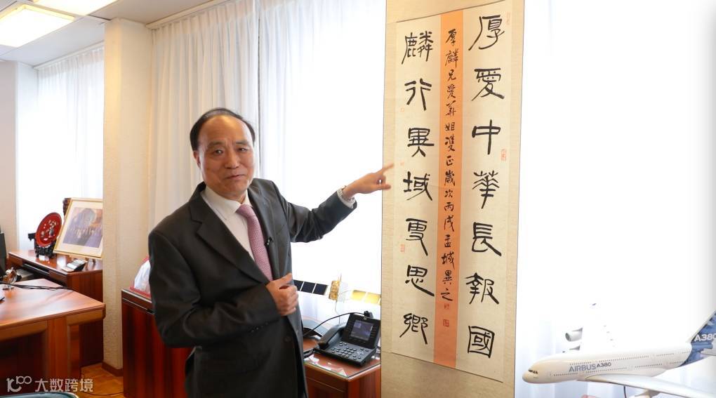 在赵厚麟的办公室中,沿窗一排柜子上,摆满了赵厚麟与各国首脑的合影,还有他珍藏的来自家乡的礼物。其中有一幅高邮籍书法家书写的藏头楹联,“厚爱中华长报国,麟行异域更思乡”,赵厚麟说,这两句话,贴切地表达了他对祖国和家乡的思念之情。