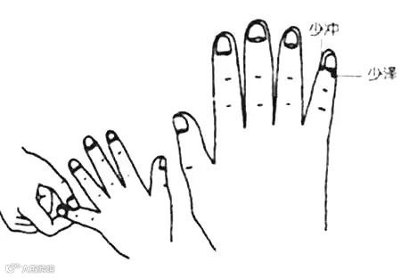 靠无名指一侧的小指指尖叫少冲穴,另一侧叫少泽穴。