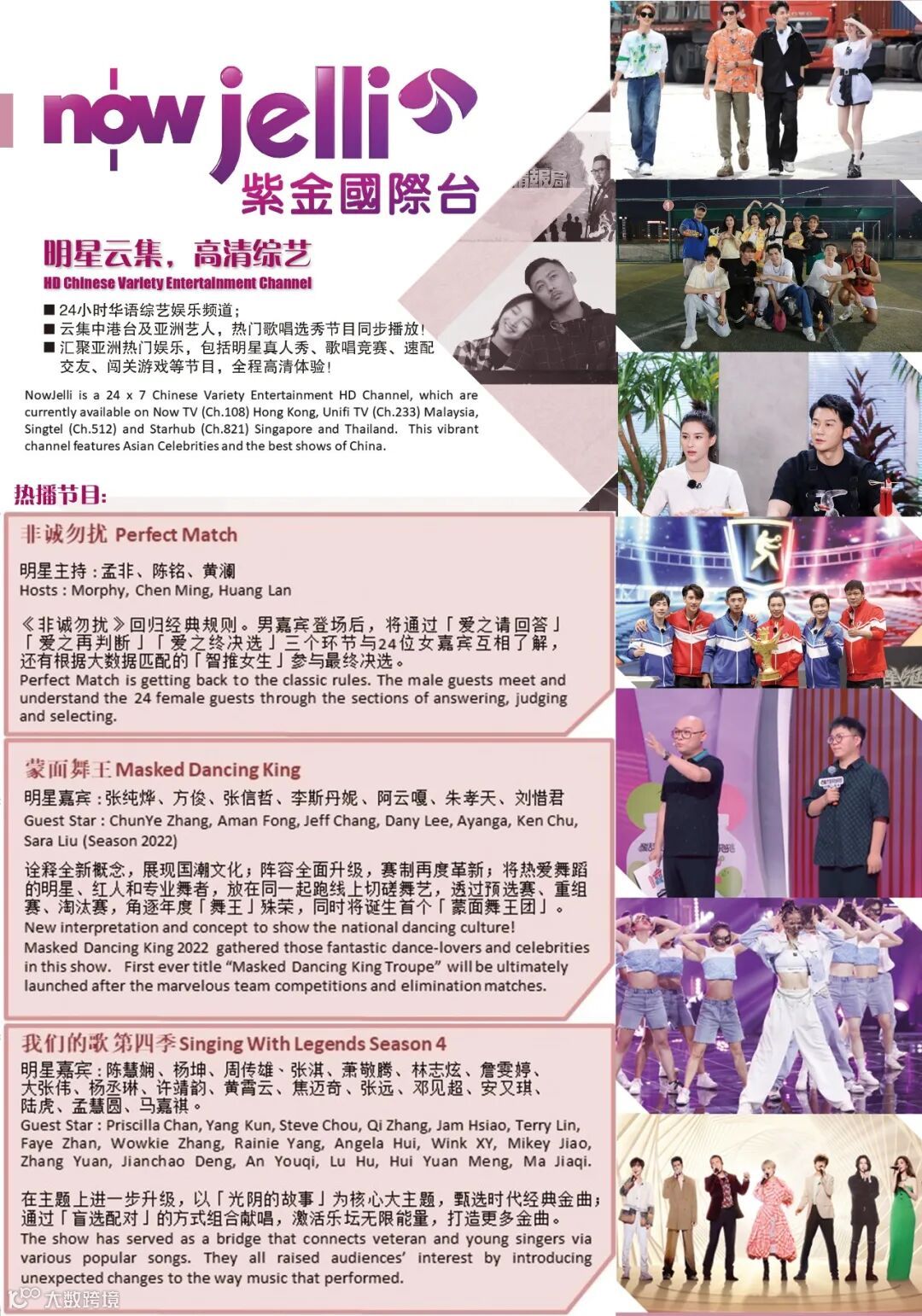 now jelli紫金国际台目前已进入中国香港now tv、马来西亚TM、新加坡SingTel及StarHub、泰国viu等多个平台。