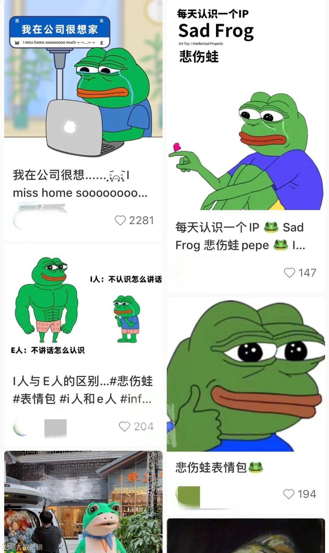 对悲伤蛙的了解,来自于七夕、情人节时大家对“孤寡”的调侃。外形设计上略显颓废、失望的神态,和当代年轻人的“丧”有异曲同工之处,只要一遇到颓、丧、废、失望、受挫等消极词汇时,都能用悲伤蛙的表情来替代,可以充当年轻人的嘴替,从而获得了大家的喜爱之情。