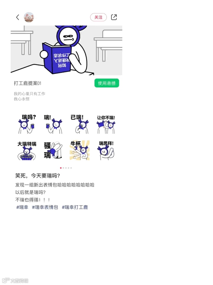 以瑞幸咖啡推出的「瑞幸打工鹿」为例,这组表情包不仅充分结合了「摆烂」、「让我康康」等时下比较热门的聊天热词以及网络热梗,其形象在确保可爱、魔性的同时也与瑞幸品牌在受众心中的认知高度契合,实现了营销传播时的品效合一。