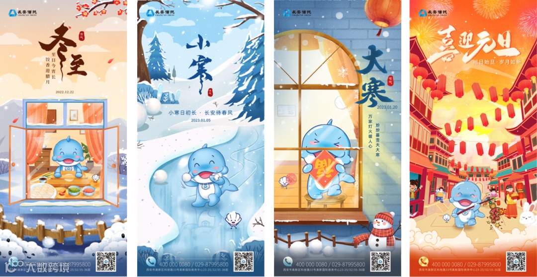 长安财富对海豚“安安”进行角色场景划分,推出一系列专属表情包及周边产品,并以“安安”为主人公推出了中国传统二十四节气海报,可爱生动的IP形象搭配特色卡通画面场景,再结合相应的节气特色,让整张海报显得格外灵动,增强了海报的记忆点,加深了用户对该品牌的印象。