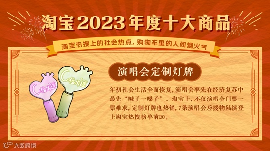 天猫双11的数据显示:演唱会相关成交暴涨300倍,其中定制灯牌的销量最高。有经营演唱会荧光棒的淘宝店主表示,今年是其十年来生意最好的一年。