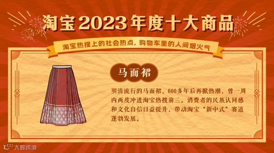 马面裙作为今年最热门的国风服饰单品,入选“淘宝2023年度商品”。今年双11,淘宝平台卖出了超73万条马面裙,能铺满105个足球场。
