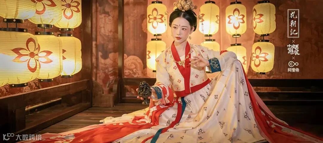 像淘宝店铺“流烟昔泠”和《陈情令》的联名款,连续3个多月霸榜消费者最爱的汉服前五位,而剧中人物魏无羡的专属定制套装,更是在一个月里增长了三倍多。“花朝记”和《长安十二时辰》联合推出的大袖儒裙,更是几个月里暴涨了12倍。
