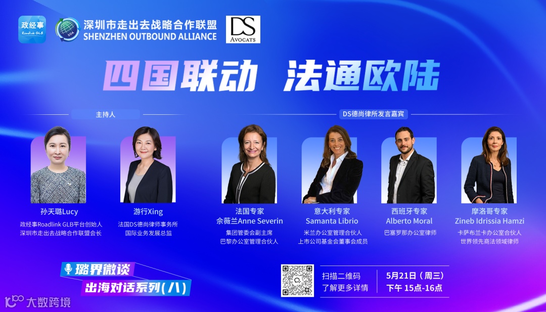 5月21日,我平台举办了一场以“璐界微谈:出海对话系列(八)——四国联动,法通欧陆”为主题的直播活动,聚焦中国企业出海欧洲与非洲的法律挑战。本场直播邀请到法国DS德尚律师事务所国际业务发展总监游行、法国DS德尚律师事务所法国专家、集团管委会副主席、巴黎办公室管理合伙人Anne Severin佘薇兰、法国DS德尚律师事务所意大利专家、米兰办公室管理合伙人、上市公司基金会董事会成员Samanta Librio、法国DS德尚律师事务所西班牙专家、巴塞罗那办公室律师Alberto Moral、法国DS德尚律师事务所摩洛哥专家、卡萨布兰卡办公室合伙人、世界领先商法领域律师Zineb ldrissia Hamzi等多位专家,与我平台创始人孙天璐一同进行对话。