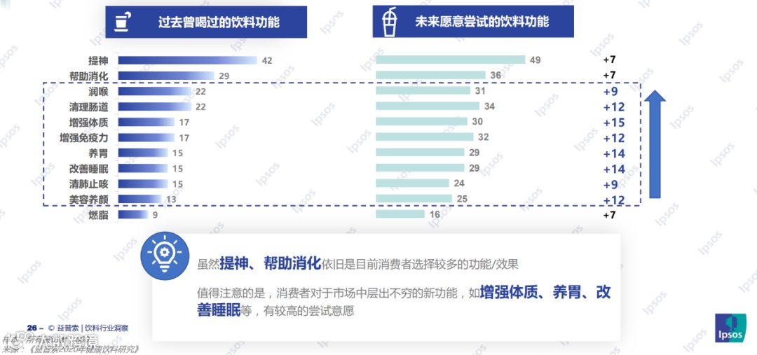 根据美国哈特曼集团(Hartman Group) 2018年发布的一份《2018现代饮料文化》报告显示,62%的消费者认为饮料对他们的健康至关重要,且消费者越年轻,这种信任就越强烈。其中44%的消费者希望从饮料中获得一些益处,比如提供能量,营养或其他健康益处。这引起了千禧一代的共鸣,这一比例上升至55%。