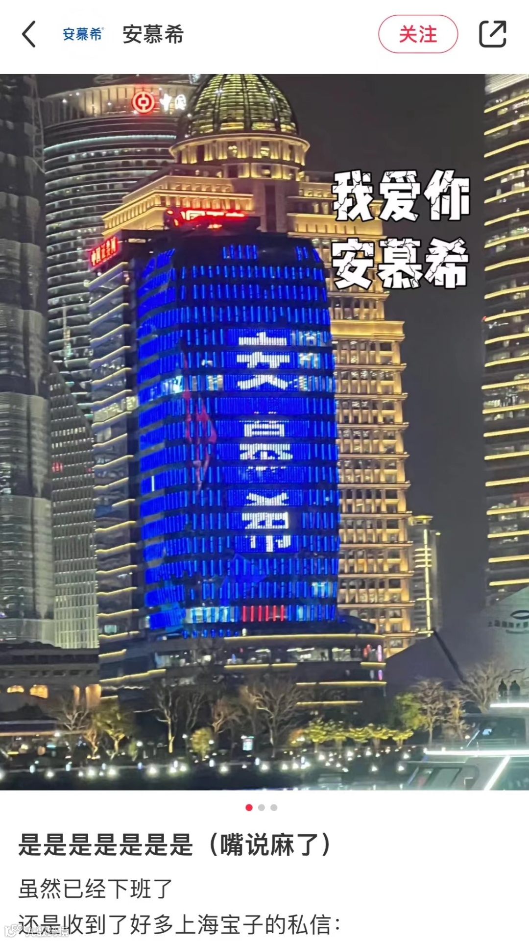 案例简介 :上海有一栋大楼长得很像安慕希,在小红书引发热议,安慕希闻着热点追去顺势在底下跟贴说“是的,那这一次我要夺回属于我的大楼”。当时以为只是一句霸气回应,没想到后续安慕希真的来夺回了“安慕希大楼”——在大楼屏幕播放整整一周 “安慕希灯光秀”和拿下后的摆摊计划,引发网友们帮安慕希一起为 “夺回大楼” 出谋划策。