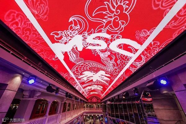 位于MSC荣耀号中心的荣耀大道,有“海上香榭丽舍大道”之美名,长达96米,集娱乐、餐饮、购物于⼀体,其上方的80⽶LED天幕,特邀新锐数字艺术家,为中国宾客定制独家视觉奇观,动态呈现四大主题画面“烟雨江南、只见青绿、花开富贵、龙跃凤鸣”。MSC荣耀号还配备了拥有超过75级台阶的施华洛世奇水晶旋梯,镶嵌有超50,000颗施华洛世奇水晶,每一步都熠熠生辉。