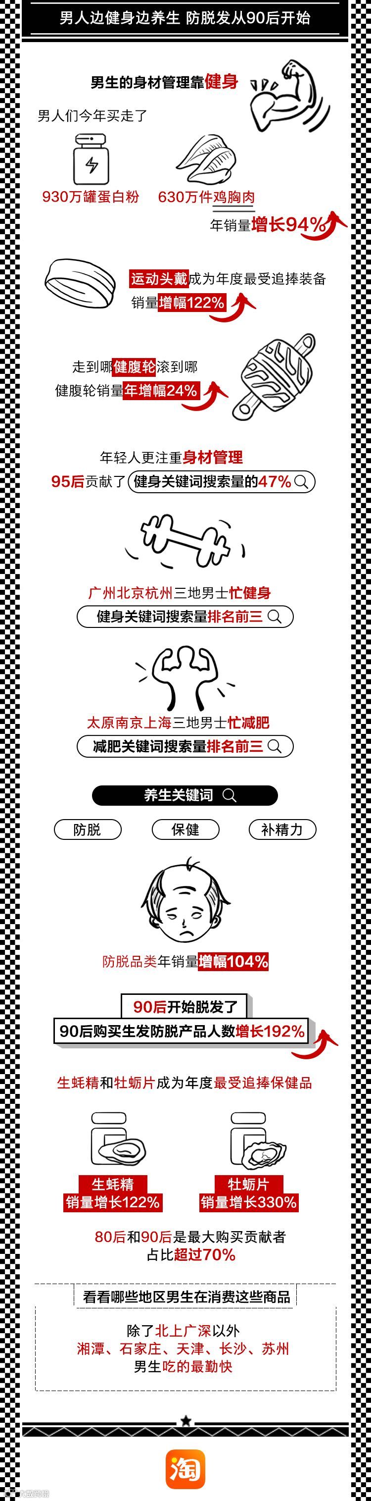 无论多么精致的健身男孩,都逃不了保温杯泡枸杞的命运,养生成了一种玄学。2018年全民“防脱”保卫战打的轰轰烈烈,连90后都成了脱发星人,今年他们在淘宝上购买生发防脱产品增加了两倍。武汉男人发际线堪忧,假发购买相较与去年增长三分之一,紧随其后的是苏州和重庆,而杭州的男人则喜极而泣,本年度假发购买量终于迎来下降!而长沙苏州的男生最怕虚,生蚝精和牡蛎片成为年度最受追捧保健品。