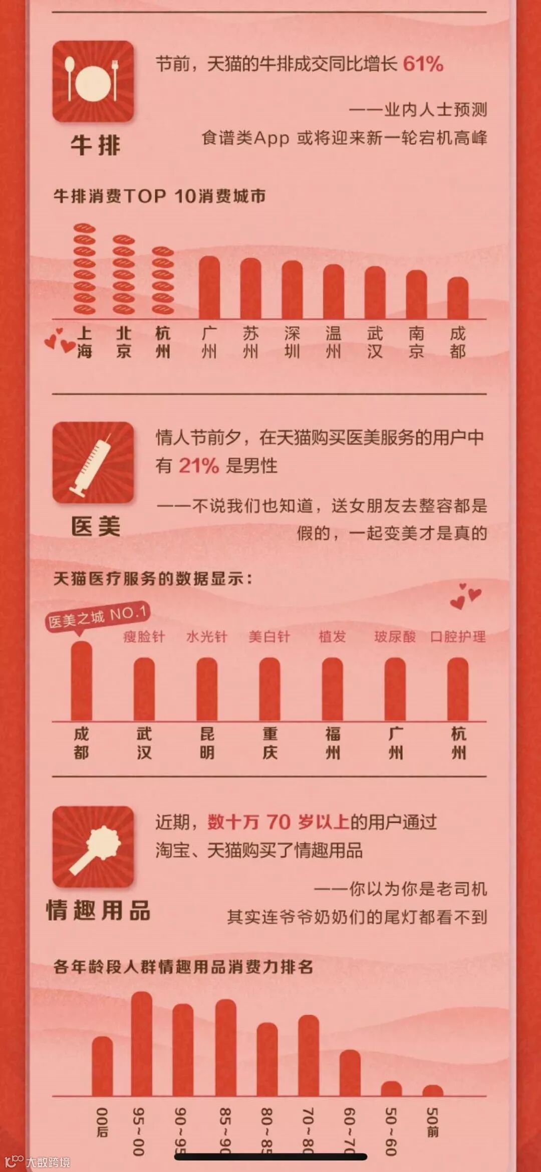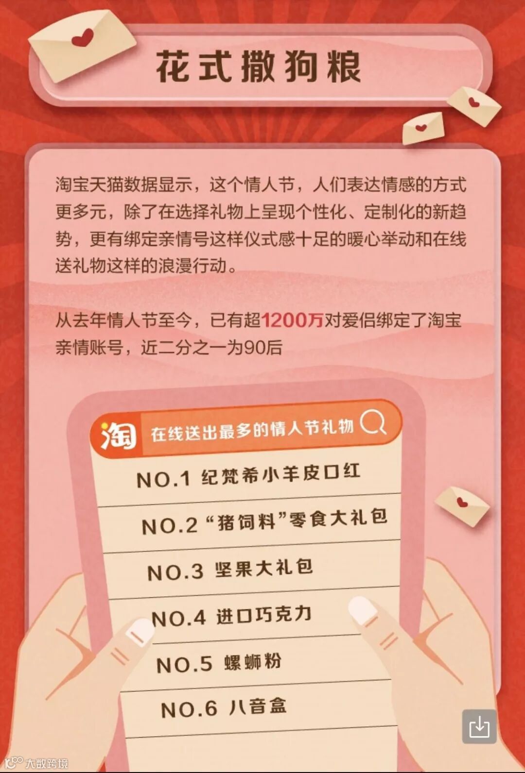 如果说春节是展示亲情的最佳窗口,那么情人节前不断升温的“浪漫经济”,则是中国人对爱情最真实的表达。日前,淘宝天猫发布了2019十大“表白神器”,其中“可以吃玫瑰”、4J以上车厘子、医美服务、情趣用品等成为这个情人节的新趋势爆款。同时,已有超过1200万对情侣绑定了淘宝亲情账号,承包另一半的心愿。这种“花式撒狗粮”的浪漫经济,正在成为拉动GDP的一股新生力量。