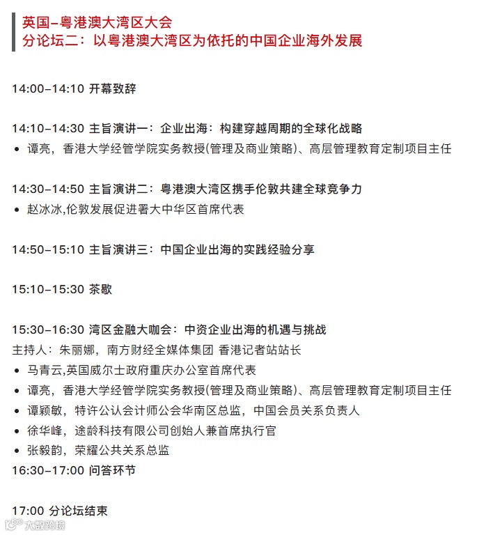 主论坛结束后,我们将于 14:00-17:00 同步举行分论坛一“粤港澳大湾区——国际企业进入中国市场的战略门户”与分论坛二“借力大湾区出海,布局全球市场”。