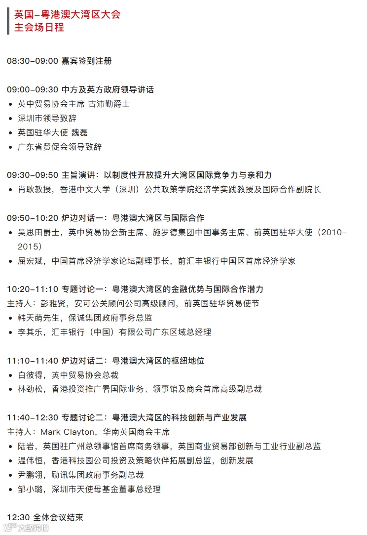 2025年,英国-粤港澳大湾区大会将聚焦粤港澳大湾区日益提升的全球影响力。会议将邀请包括英国驻华大使魏磊、英中贸易协会主席古沛勤爵士及新任主席吴思田爵士在内的中英政商界领袖及投资者,共同探索合作与发展的新路径。下午的两场分论坛将深入探讨两大议题:大湾区作为全球投资中国的关键门户,以及其助力本土企业拓展全球布局的枢纽作用。我们诚挚邀请您出席由我平台支持的2025年英国-粤港澳大湾区大会,会议将于2025年11月20日(星期四)在深圳前海举行。拟参加的企业代表请提前扫码报名。
