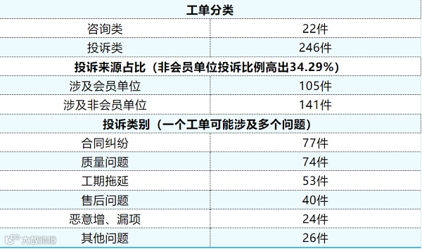 今天,上海市装饰装修行业协会发布2023年10月“12345市民服务热线”住宅装饰咨询、投诉协调信息工作情况:2023年10月,共接到装修咨询、投诉工单共计268件;相较于9月,总量上升18.58%。合同纠纷、质量问题、工期拖延,排在前三;其中,合同纠纷中常见的问题有退定金纠纷、延期赔付问题、口头承诺的赠品未赠送等等。