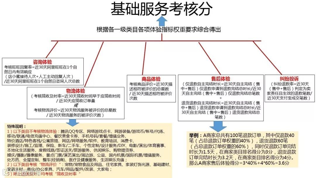 举例:店铺A属于X类目,单项维度得分如下,商品体验4 分、物流体验3分,售后体验2分,纠纷投诉5分,咨询体验4分,则店铺A的“基础服务考核分“=物流体验(3*20%)+商品体验(4*25%)+售后体验(2*20%)+纠纷投诉(5*20%)+咨询体验(4*15%)=3.6分。