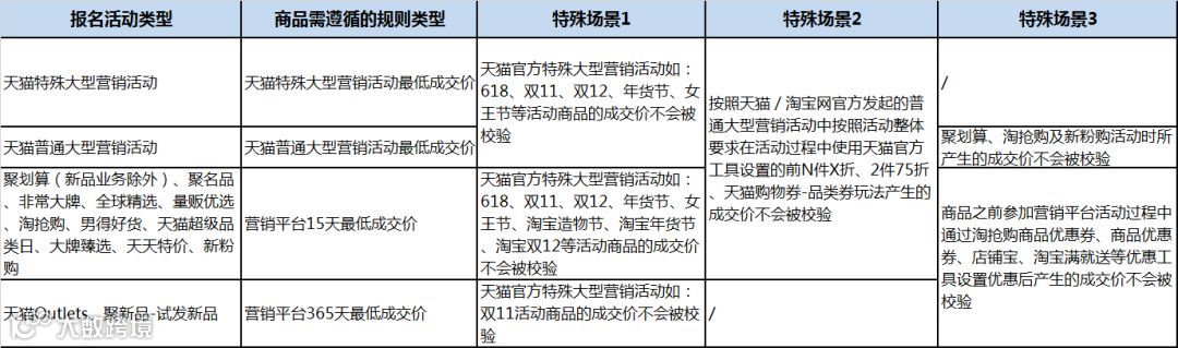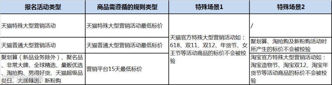 (2)以下特殊情形所产生的最低标价在报名营销活动时不会被校验:秒杀、天猫U先、雷锋侠、聚划算拼团、天猫预售、超级会员店的超级会员价、天猫平台前N件优惠等。