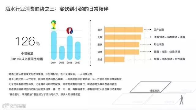 酒水曾是宴席上不可缺少的必备品,但现在的年轻人们似乎不再习惯杯酒论英雄,而更偏爱一人纯享足矣。《报告》显示,小包装酒在2017年的成交额同比增加126%。
