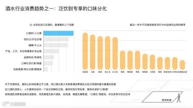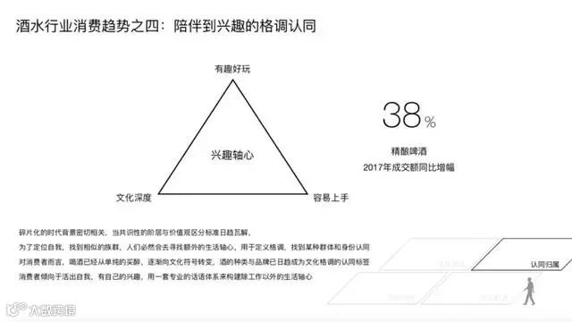 对消费者而言,喝酒已经从单纯的买醉,逐渐向文化符号转变,酒的种类与品牌已日趋成为文化格调的认同标签。不同消费者从自我定位出发,开始通过酒寻找某种群体和身份认同。
