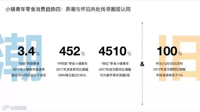 有了网络的放大,“抖音”同款零食颇受喜爱,“IP同款”零食2017年gmv增长超过150%,被打上“网红”标签的零食增长势头更猛,2017年小镇青年的成交额同比增幅达4510%,约为都市青年涨幅的2倍。从某种意义上来说,他们才是这个时代的弄潮儿,开始引领流行趋势,甚至反向影响都市。