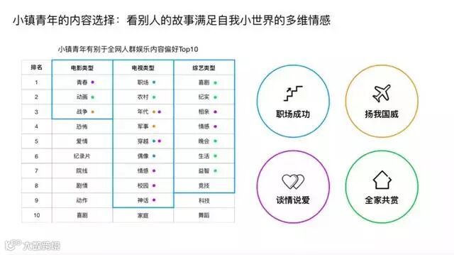 要通过内容打动消费者,我们就要深度洞察他们的内容喜好。阿里妈妈发现,小镇青年更偏向于喜爱青春、动画和战争类型的电影,电视类型则聚焦于职场、农村、年代等题材。综合来看,职场成功、扬我国威、谈情说爱和全家共赏类的内容,更能走进小镇青年的内心,以此满足自我小世界的多维情感。