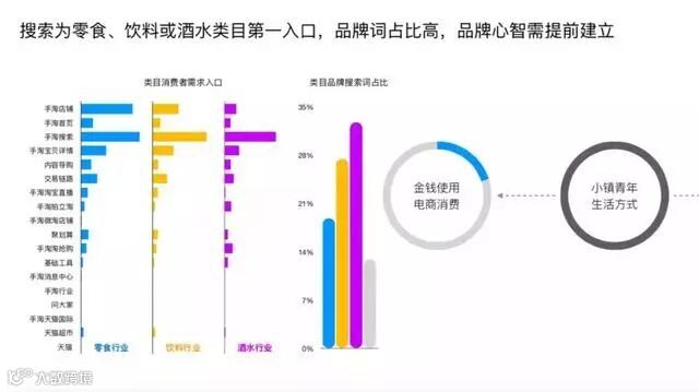 从小镇青年的购买链路来看,手淘搜索依旧是零售、饮料或酒水类目的第一入口,其次是手淘店铺、宝贝详情、首页和交易链路等。其中尤以酒水行业的品牌搜索词占比最高,接近35%,饮料和零食紧随其后。