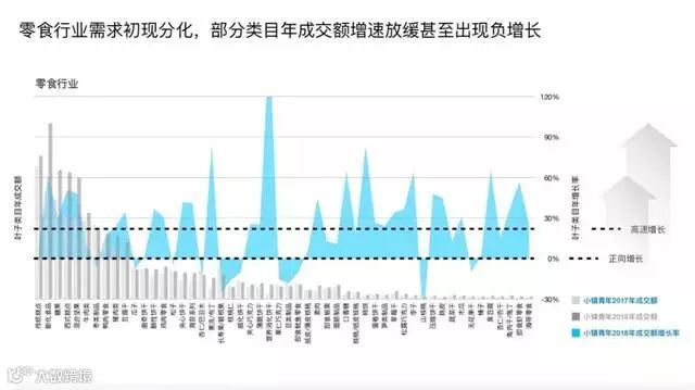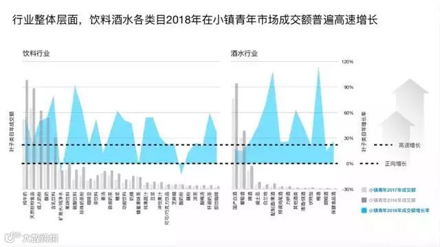 在饮料、酒水行业,2018年小镇青年市场的成交额普遍高速增长,意味着该人群存在的巨大潜能,零食行业则面临需求分化、品质升级的趋势,也暗示品牌竞争的进一步加剧。