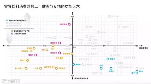 消费者对健康的诉求,也日渐体现在零食的选择上。营养方便的即食果实类,比如蔬菜干、草莓干、菠萝干、木瓜干等正在成为消费者的新选择,反之,高油脂的种子类干果、甜腻的传统糕点,正在被市场抛弃。