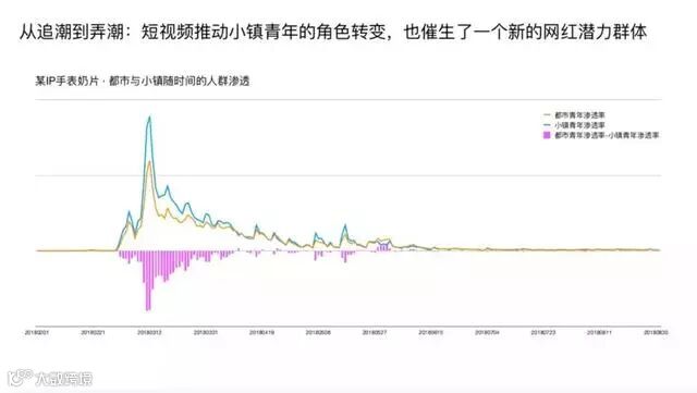 以一款来自巴厘岛的新品蓝色饮料为例,阿里妈妈发现从今年初开始,小镇青年对该产品的渗透率从远落后、变成远超于都市青年,年龄集中于18-26岁的年轻人。而今年三月爆红网络的某IP手表奶片,更是在小镇青年群体中掀起娱乐狂欢。