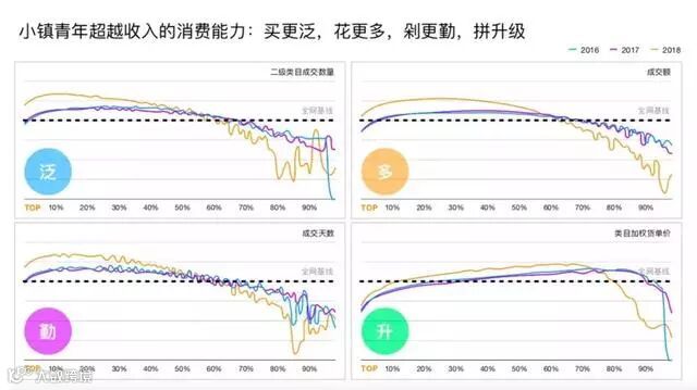 从近三年手淘和天猫成交额来看,小镇青年的消费增速高于都市青年,他们更会合理分配消费资产,甚至提前透支,有着超越收入的消费能力。