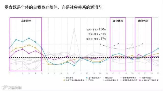 零食的功能之于消费者来说,分化趋势明显。零食既是个体的自我身心陪伴,又是社会关系的润滑剂。《报告》显示,在零点到5点这段独处时间,豆干制品、牛肉干卤味、鱿鱼丝等增长明显,下午三点到六点则多为办公室场景,晚间是家庭场景,超大包装的零食在这些时段增长超过230%。