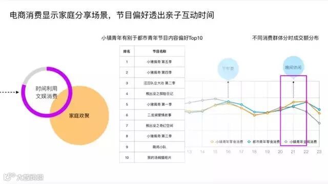 小镇青年们在什么时间看视频呢?《报告》显示,晚上八点到十点是家庭欢聚的时刻,小镇青年家庭一边合家看电视,一边吃零食,是最常见的场景。零食消费和购物在晚间休闲时达到一个小高峰,动画片《小猪佩奇》、《汪汪队立大功》等是最受小镇青年受众喜爱的电视节目。