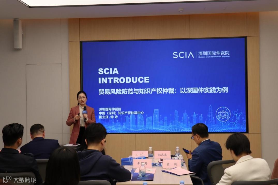 ▲图为中国(深圳)知识产权仲裁中心副主任钟妙围绕贸易风险防范与知识产权仲裁:以深国仲实践为例作分享