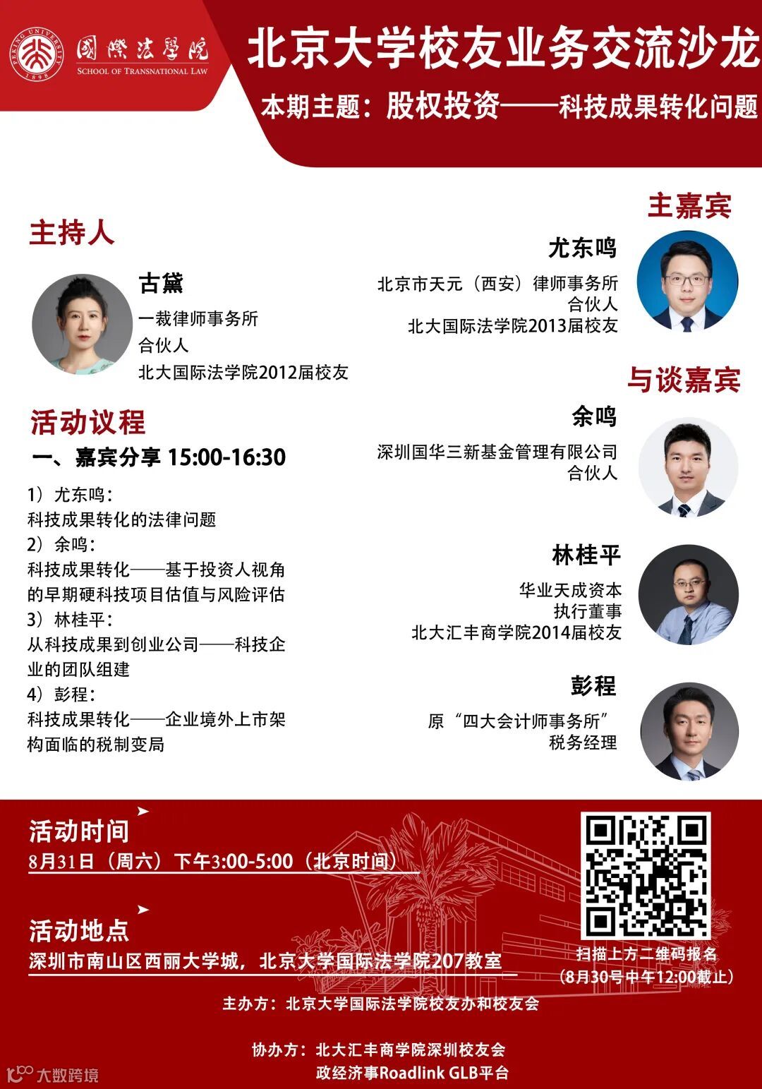 本期主题为:股权投资--科技成果转化问题,北京大学校友业务交流沙龙定于2024年8月31日(星期六)15:00-17:00于深圳市南山区西丽大学城举办。本活动由北京大学国际法学院校友办和校友会主办,北大汇丰商学院深圳校友会、政经事(Roadlink GLB)平台协办。拟参加的企业扫描下方二维码或点击“阅读原文”报名。