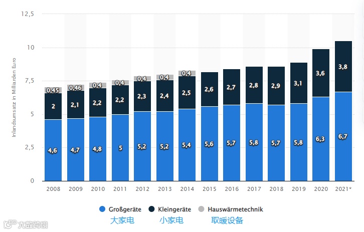 图:德国国内家电市场销售额(单位:十亿欧元)