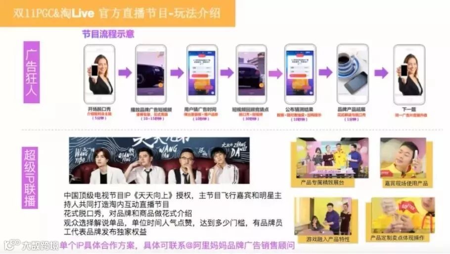 去年,淘宝直播官方首次推出的淘Live,这一栏目的玩法,今年也会进行延伸和深入。在11月1日开始至11月10日期间,20:30-21:00及21:00-23:00两个黄金时段,淘宝直播将会推出“广告狂人”的互动IP直播,携手《天天向上》、《这就是灌篮》等超级IP直播的两大官方玩法,打造每天一品类,进一步营造大促购买氛围,促进消费者购物冲动。