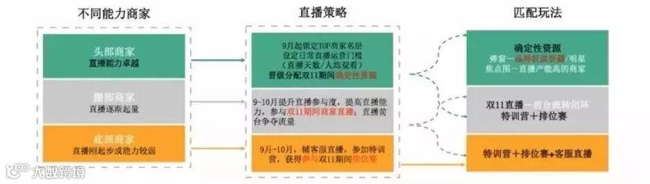 因此,不同能力的商家,依据自己的条件,可以针对双11打出不同玩法和策略。处于头部的商家,自9月起,可以从直播天数、人均观看等方面设定日常直播运营门槛,争取双11期间确定性资源;腰部商家则可以提升直播参与度与能力,通过特训营和排位赛,参与双11直播的之中,争夺直播前台流量;而刚起步的直播商家,在9-10月份,可以考虑培养提升客服直播质量,争取新增的客服直播子模块浮现机会。
