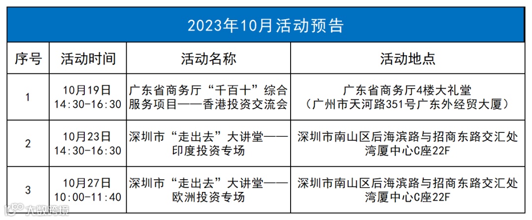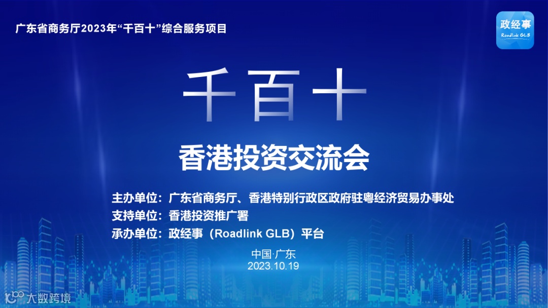 为加强粤港两地合作,增强粤企对香港投资营商环境了解,助力企业更好地融入粤港澳大湾区建设,由广东省商务厅、香港特别行政区政府驻粤经济贸易办事处主办,政经事(Roadlink GLB)平台承办,香港投资推广署支持的『2023年“千百十”综合服务项目—香港投资交流会』定于2023年10月19日(星期四)下午14:30-16:40举办,宣讲以“线下会场+线上直播”形式展现。拟参加的企业代表请提前扫码报名。