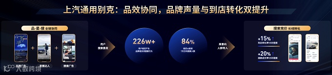 汽车品牌别克是通过搜索撬动新增量的典型案例之一。别克加强搜索品专投放,触达存量A3人群的同时获取新流量,并通过搜索竞价投放和搜后落地页承接,实现投放后7天日均搜索人数增加84%,搜索到店转化率和搜索成交率分别提升15%和20%。