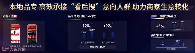 团购+直播+品专组合,也能倍速提升搜索GMV:团购让利配合品专流量收口,及时沉淀高意向人群至品牌私域,配合直播促成转化。数据显示,在团购+直播+品专组合加持下,商家千次搜索GMV有效提升46%。