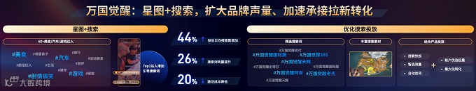 例如,「万国觉醒」游戏通过内容建设和搜索广告的策略协同,突破了拉新转化、存量用户付费两大瓶颈。在内容方面,针对头部达人的爆款种草视频增加底部搜索词;在投放方面,基于用户历史搜索词高频优化搜索词包,配合内容素材灵活调整、加强智选拓流能力,最终实现投后日均搜索数增加44%,搜索消耗量提升26%,激活成本降低20%。