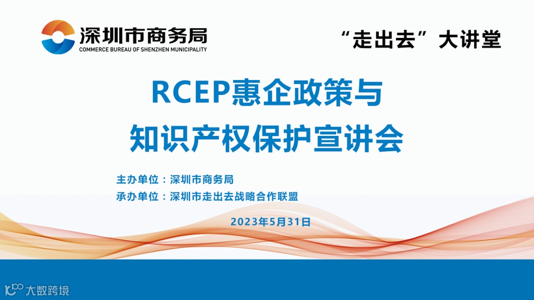 为进一步帮助我市企业规避知识产权风险,更好抢抓RCEP机遇,2023年5月31日下午,由深圳市商务局主办、我平台运营组织深圳市走出去战略合作联盟承办的“2023年深圳市“走出去”大讲堂——RCEP惠企政策与知识产权保护宣讲会”通过“线下会场+线上直播”形式成功举办,线上线下参会企业代表超1万人(次)。深圳市商务局对外合作处副处长吴月溪出席本次活动并致辞。我平台政策部负责人梁秋荣参加本次会议。