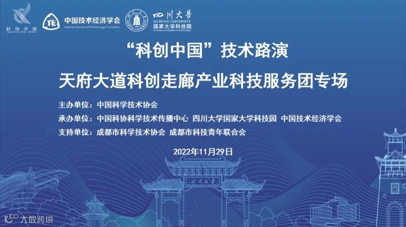 2022年11月29日,由中国科学技术协会主办,中国科协科学技术传播中心、四川大学国家大学科技园、中国技术经济学会承办,成都市科学技术协会、成都市科技青年联合会支持的“科创中国”技术路演天府大道科创走廊产业科技服务团专场在四川大学国家双创示范基地——高新技术企业孵化平台举行。