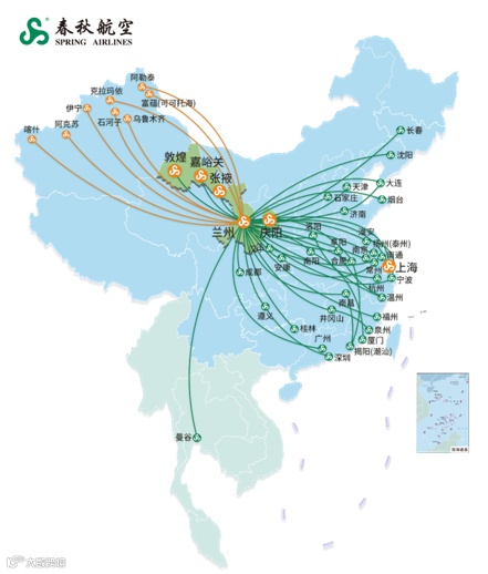 春秋航空2009年3月首航上海至兰州,2019年成立兰州基地,致力于“全国干线网”“全国支线网”“甘肃省内网”“经兰进疆网”四网建设。目前,春秋航空在兰州的航线覆盖华东、华北、西北、西南、中南等,春秋的兰州基地规模成为仅次上海的第二基地。