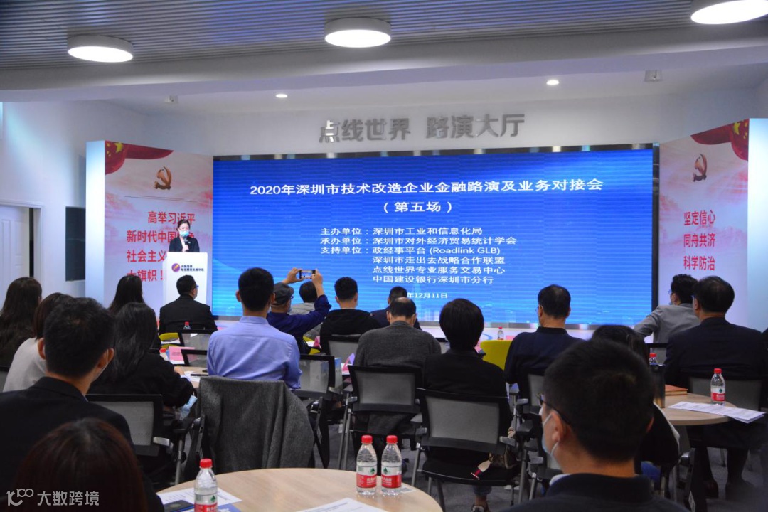 2020年12月11日下午,由深圳市工业和信息化局主办,深圳市对外经济贸易统计学会承办,政经事平台(Roadlink GLB)、深圳市走出去战略合作联盟、点线世界专业服务交易中心、中国建设银行深圳市分行支持的『2020年深圳市技术改造企业金融路演及业务对接会(第五场)』在深圳市福田区点线世界专业服务交易中心路演大厅顺利举行。