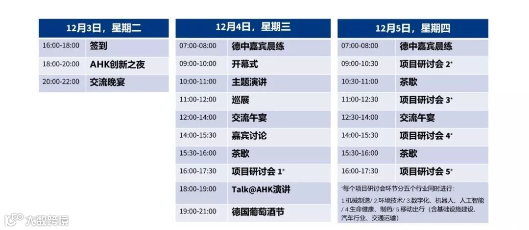 每个时间段的项目研讨会环节都会分为5大主题,参会者可以选择自己最感兴趣的主题参加:1.机械制造/2.环境技术/3.数字化、机器人、人工智能/4.生命健康、制药/5.移动出行(含基础设施建设、汽车行业、交通运输)。
