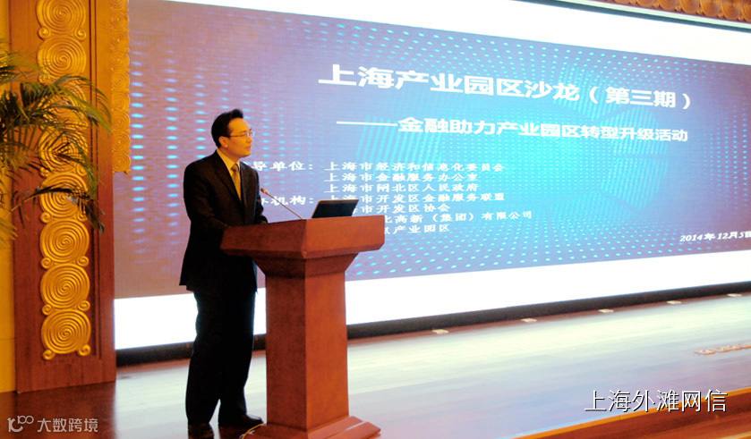 2014年12月5日下午,在上海市经济和信息化委、市金融办指导下,在闸北区政府的支持下,由上海市开发区金融服务联盟、上海市开发区协会、上海市市北高新集团共同主办的以金融助推产业园区转型升级为主题的“上海产业园区沙龙第三次活动”在市北高新技术服务业园区举行。上海市金融办、市发改委、市国资委、市科委、市经信委、市规土局、市财政局、市环保局等相关部门负责人,以及部分园区开发机构、中介服务机构、部分区县及街镇相关部门负责人,银行、担保、证券、基金公司、投资、融资租赁、小贷、互联网金融等金融机构代表和新闻媒体近240人参加了会议。