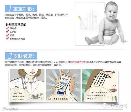 尿疹、小面积伤口、烧伤、敏感肌肤、干性肌肤、干裂的嘴唇、过敏性皮炎等,出现上述症状后抹上这款万用软膏,在六小时内就会发现皮肤症状明显减少和得到缓和。